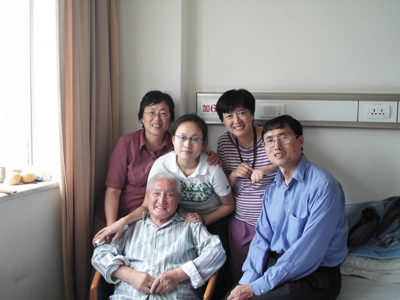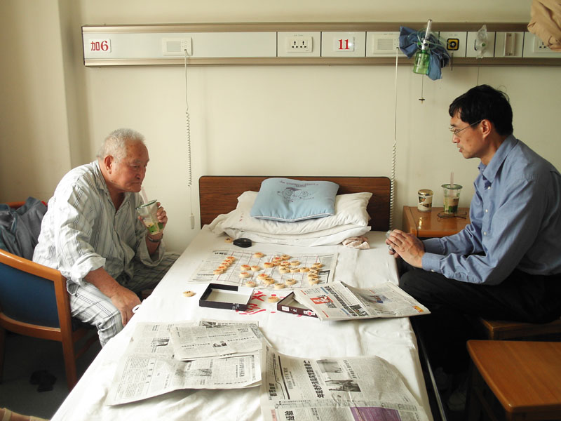 左图是在病房内与儿子曹群建下棋;右图是与子女的合影,后排左起:曹群进、曹晓群(群进的女儿)、曹群怡、曹群建