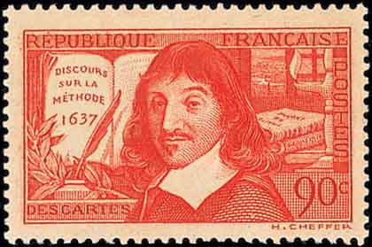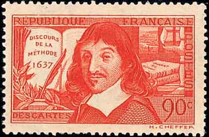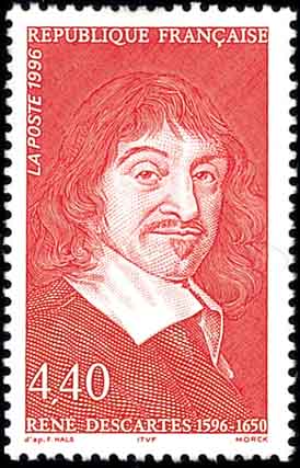 对于笛卡尔(René Descartes, 1596-1650, 图1是法国为纪念笛卡尔诞生400周年发行的邮票)大家对他的认识可能是从笛卡尔坐标系(图2是德国邮票)开始. 实际上他是学法律的, 得到法学博士学位, 主要从事哲学方面的研究, 但也精于研究数学. 1637年他出版了著名的哲学著作《方法论》一书(图3是法国为纪念《方法论》发表300周年的邮票, 发行后发现把书名印错成 Discoure sur la Methode. 遂即重新印发正确书名Discoure de la Methode的邮票, 图4). 该书有三个附录, 其中第三个附录是《几何学》. 在那里他引进变量概念使运算关系符号化, 创建坐标系, 建立解析几何学, 使几何曲线与代数方程得以结合.