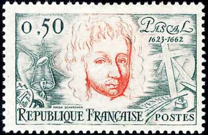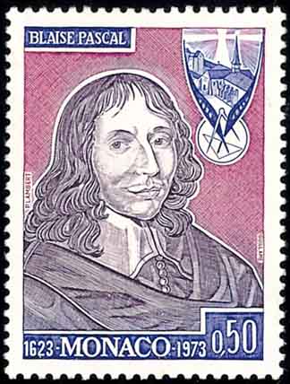 帕斯卡(Blaise Pascal, 1623-1662, 图5、图6分别是摩纳哥和法国为纪念帕斯卡诞生350周年和逝世300周年而发行的邮票)是一位天才的科学家, 他在世仅39年. 在他16岁时就写成《圆锥曲线论》, 其中他所论证的几何学定理被称作帕斯卡定理. 他应友人的要求研究赌博输赢的几率问题, 而成为概率论最早研究者之一. 与此同时, 他还得出二项式展开系数之间的相互关系, 被称为帕斯卡三角形. 在19岁时, 他就制造出世界上第一台计算机(图7是罗马尼亚发行的邮资明信片), 虽然笨重异常, 但可以进行八位数的四则运算. 35岁时完成名著《摆线论》, 给出求不同曲线图形的面积和重心的一般方法.