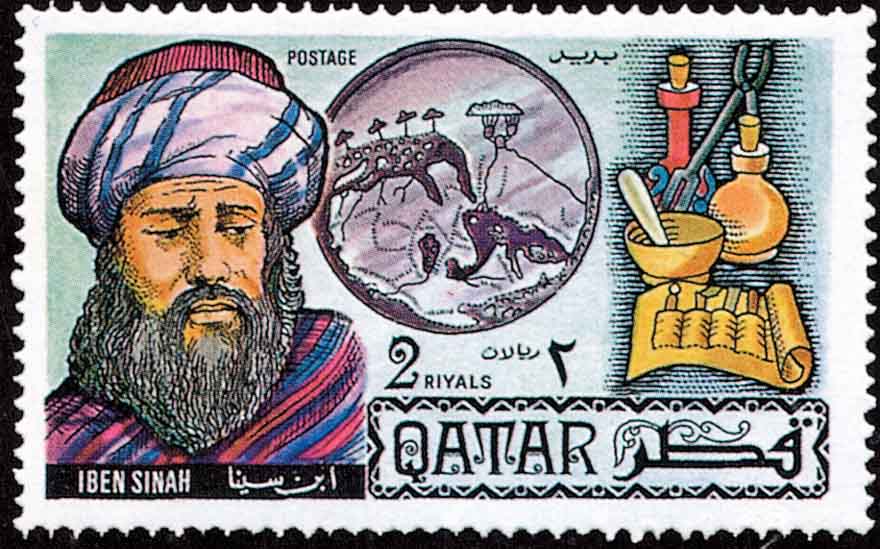 阿拉伯哲学家阿维森纳(Avicenna, 亦称伊本·西纳(Ibn Sina, 公元980-1037, 图6是卡塔尔邮票)在算术和数论方面有重要的贡献, 并把数学应用于解决物理学和天文学方面的问题.