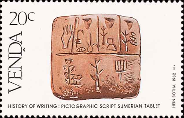 但是结绳还是不甚方便, 于是又出现了在实物(如木头、石板、骨头等)上的刻痕记数方式, 这在中外文献中都有记载和实物标本. 图4的左上方画的就是古人在木柱上刻痕的画面, 刻痕记数应该说就是数文字的雏形. 图5是公元前3000年左右苏美尔人(他们居住于底格里斯河和幼发拉底河之间地带)的记数泥板, 图6是古阿尔及利亚人刻在木板上的计算表格.