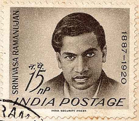 印度数学家拉马努金(Srinivasa Aiyangar Ramanujan, 1887-1920,图4为印度发行的纪念拉马努金诞生75周年的邮票)早期曾就读于马德拉斯大学, 1914年应邀去英国剑桥大学,随数学家哈代(Hardy)和李特伍德(Littlewood)从事数学研究。对解析数论,尤其整数分拆、素数分布、连分数等方面都有重大贡献。 他在30岁时获得英国皇家学会会员以及三一学院研究员。
