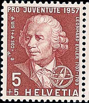 微积分对力学问题的应用引导出另一门新的数学分支 — 偏微分方程。1747年,达朗贝尔(d'Alembert, 1717-1783)的论文《张紧的弦振动时形成的曲线的研究》可以说是偏微分方程方向的开创论文,在那里达朗贝尔导出了弦的振动所满足的偏微分方程并求出它的通解。 1749年,欧拉(Euler,1707-1783,图1是1957年瑞士纪念欧拉诞生250周年发行的邮票)发表的论文《论弦的振动》讨论了同样的问题,并沿用达朗贝尔的方法, 引进了初始条件下正弦级数的特解。1785年拉普拉斯(Laplace,1749-1827)在论文《球状物体的引力理论与行星形状》中导出一类重要的偏微分方程 — 位势方程, 现在称为“拉普拉斯方程”。到19世纪,随着物理学所研究的现象从力学向电学以及电磁学的扩展,偏微分方程的求解成为数学家和物理学家关注的重心。1822年, 法国数学家傅立叶(Fourier,1768-1830)发表的论文《热的解析理论》,研究了吸热或放热物体内部任何点处的温度变化随时间和空间的变化规律, 导出了三维空间的热传导方程。和常微分方程一样,求偏微分方程显式解的失败,促使数学家们考虑偏微分方程解的存在性问题。