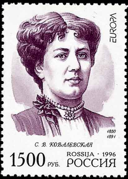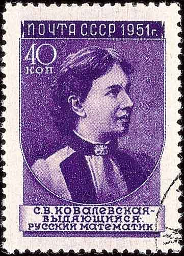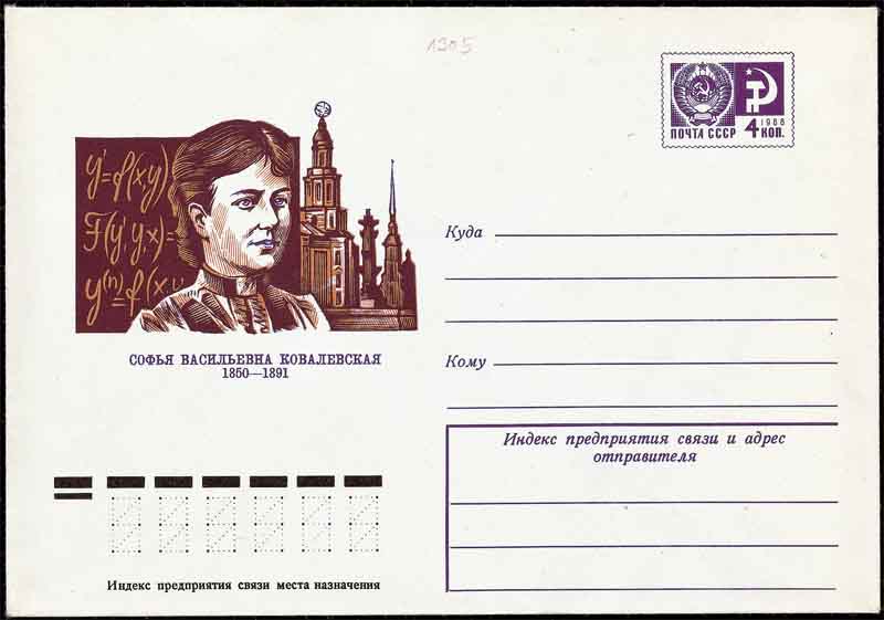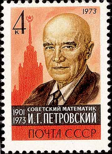 柯西(Cauchy,1789-1857,图2是1989年法国纪念柯西诞生200周年发行的邮票)是研究偏微分方程解的存在性的第一个人。 柯西的工作被俄国女数学家柯瓦列夫斯卡娅(Софья Васильевна Ковалевская,1850-1891, 图3是1951年前苏联纪念柯瓦列夫斯卡娅逝世60周年发行的邮票; 图4是1996年俄罗斯为欧罗巴杰出女性发行的邮票; 图5是1974年前苏联在普通邮资封上加印的科学家)发展为非常一般的形式,柯瓦列夫斯卡娅是历史上第一位女数学博士, 也是历史上第一位女科学院院士。曾任莫斯科大学校长的彼得罗夫斯基(Иван Геортиевич ПетровскийИ,1901-1973, 图6是1973年前苏联纪念彼得罗夫斯基逝世发行的邮票)在偏微分方程论,尤其在定性理论、方程分类等方面都有重要贡献。