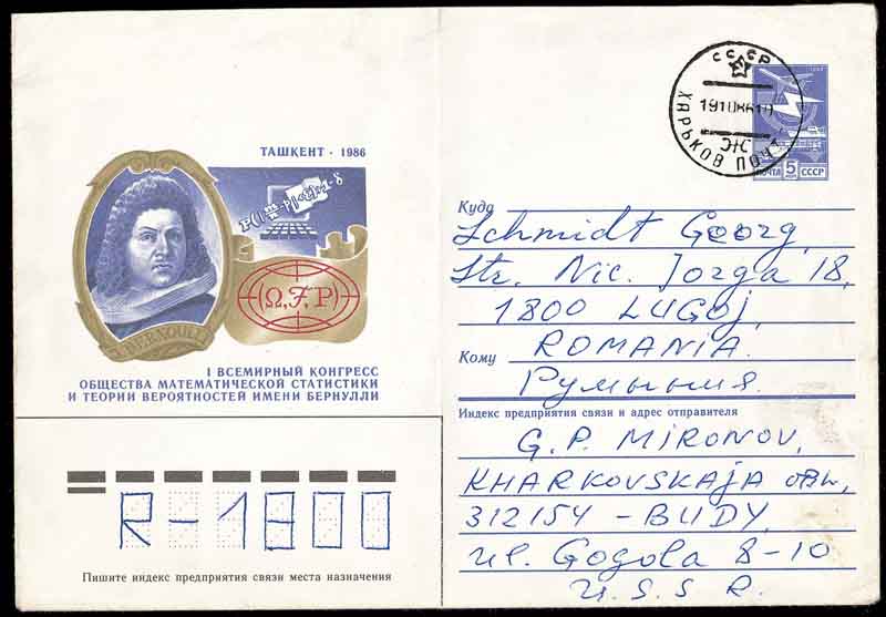 图6是苏联为纪念1986年在前苏联塔什干召开的“第一届世界数理统计与概率论大会”而发行的邮资信封。信封左面是概率论奠基人贝努利的头像和他所建立的极限定理。