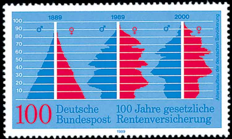 比如法国数学家拉普拉斯(Pierre Simon Laplace,1749-1827,图1)根据1745-1770年巴黎男女婴儿统计数据推断出: 当女婴数为100时,男婴数为106是最合适的比例。如图2则是根据德国1889年到1989年人口统计资料, 推算出2000年的人口状况。在图中从左至右分别显示1889年和1989年的各年龄段(每十岁一段)男女人口数据以及所预测出的2000年各年龄段男女人口数据。由此,我们也不难看到至2000年德国男女婴儿比例适当, 人们的寿命在增长,养老保险事业在发展等等。又比如,通过观察一个国家或地区的人口统计指标,或比较不同地区与国家的人口统计指标,可以借此评价一个国家或地区卫生保健工作方面的质量等等。