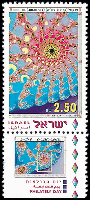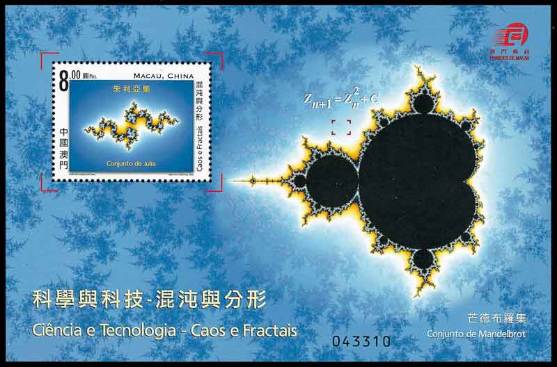 曼德勃罗集合(图7)是曼德勃罗于1979年构造的集合,它被认定为分形几何的标志性图案。它可以帮助我们更好地理解我们周围那些不规则和粗糙的世界。曼德勃罗集合的放大过程可由方程式: z=z2+c 来实现。它有的地方像日冕,有的地方像燃烧的火焰,只要你计算的点足够多,不管你把图案放大多少倍,都能显示出更加复杂的局部。这些局部既与整体不同, 又有某种相似的地方,这种梦幻般的图案具有无穷无尽的细节和自相似性。为此,曼德勃罗在1988年获得“科学艺术大奖”。曼德勃罗分形几何理论不仅用来理解数学问题,还可以用来描述许多其他领域的事物, 如湍流的波动起伏、地质活动、行星轨道、动物群体行为、社会经济学模式等等,甚至音乐也可以通过图形来表达。图7小型张中的邮票是朱利亚分形图。