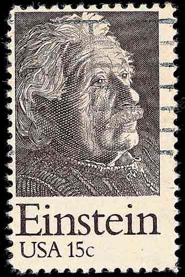 另一支非欧几里得几何是黎曼几何, 他的平行公理是: 同一平面上的任意两条直线一定相交. 著名物理学家爱因斯坦 (Albert Einstein, 1879 年出生于德国的犹太人, 1921 年获诺贝尔物理奖, 1933 年由于纳粹德国的反犹太主义, 被迫移居美国, 1955 年在普林斯顿去世. 图 5、图 6 分别是以色列和美国发行的纪念爱因斯坦的邮票) 正是对黎曼几何的研究和应用, 才使他打开了广义相对论的大门, 爱因斯坦还在 1925 年发表了《非欧几里得几何与物理学》的研究论文.