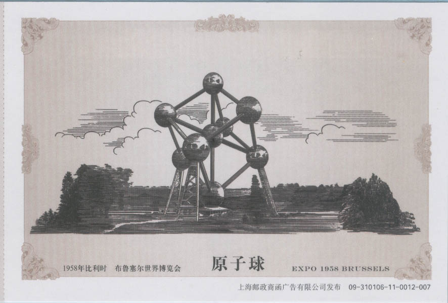 本届世博会的标志性建筑是工程师沃特金(A.Waterkein)设计的原子球(Atomium Pavilion)。 这个设计无论从思想理念还是创意形式都反映了时代特征和人们关注的热点。原子球(图3)由9个巨大内空的金属球体组成,每个圆球代表一个原子, 各球之间由26米长,直径3米的空心钢管连接。圆球与连接圆球的钢管构成一个正方体。这正是放大1650亿倍的α铁的正方体结构。9个圆球加上钢架结构总重量为2200吨, 最高球顶达102米。球面采用了5800块三角弧形铝合金焊接而成。这9个球体寓意当时欧共体拥有9个成员国,也寓意比利时国内有9个省。 因此原子球标志着比利时国家和西欧各国团结与联合。图4与图5分别是比利时和古巴发行的以原子球为主图的纪念邮票。 “原子球”的设计方案源于世界上所有物质的基础是分子、原子、中子等无限小又极为重要的东西。但是人们对其缺乏了解,感到它们神秘莫测。所以, 原子球是一座能向人们显示这些无限小的东西的建筑。同时经历了二战后,每个人对原子概念都有了新的认识,原子球体现了时代的主体意识: 即人类如何和平地利用原子能,如何解决科学技术与人道主义的问题。当然原子球建筑不仅展示它与众不同的建筑结构,也把现代建筑美学基础的纯几何形态的原则, 运用到现代空间概念的形象设计之中。同时,原子球也是比利时冶金工业能力和工程技术能力的综合体现。原子球中间有一部当时欧洲最高速的电梯。 仅23秒便可把22人送到92米的顶层圆球。顶层圆球专供游客观赏风景,四周有六面有机玻璃的大窗,并设有多架望远镜,250人可以同时从高处鸟瞰布鲁塞尔的优美景色。 此外,还有可供140人就餐的饭店和纪念品商亭。参观“顶层”后,可改乘自动梯到其它圆球。在世博会会期,原子球内展览国际核能技术, 其中有不同的核反应堆模型(图6),和一艘3万吨核动力船的模型(图7)。并强调核能的和平利用。在世博会以后,这届世博会的其他场馆都拆除了, 唯独留下原子球建筑。现在原子球不仅是1958年世博会的标志,也是比利时国家形象的标志。