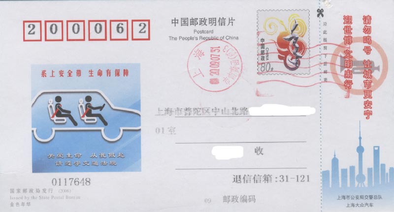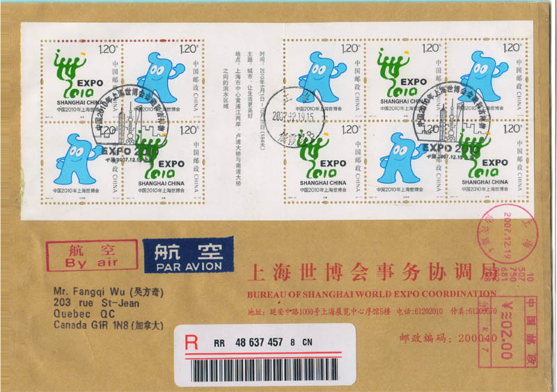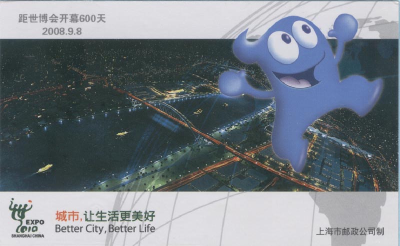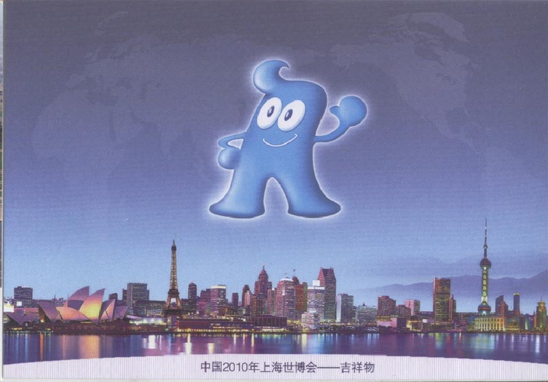 2007年1月,上海世博会组织者面向全球征集上海世博会吉祥物,共收到2.6万多件应征作品。经评选,审定上海世博会吉祥物为 “海宝(HAIBAO)”。 2007年12月18日吉祥物正式揭晓。次日邮政当局发行纪念邮票(图2是小本票的内页),并在过桥票上印有本次世博会的时间、主题和地点。 图3-1是印有会徽的中国邮资明信片和图3-2是印有吉祥物的中国邮政明信片,图4是印有主题的中国邮资明信片。