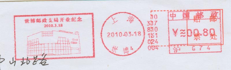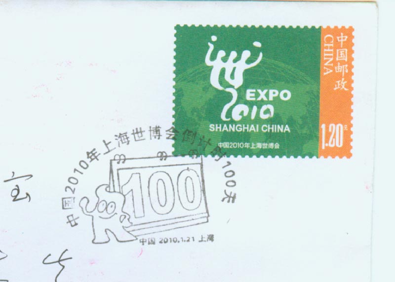 2010年1月21日是倒计时100天(图16),这时许多中外场馆相继落成。世博会官方提出:冲刺100天口号。2010年3月18日上海市世博邮政支局正式开业(图17)。