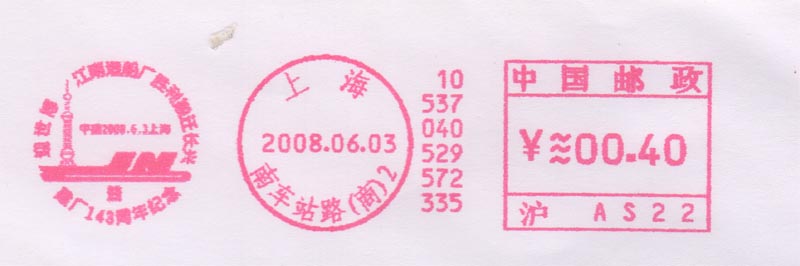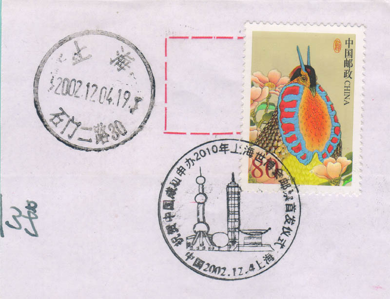 2002年12月3日国际展览局第132次成员国代表大会上,经过投票表决,中国成功地获得了2010年上海世界博览会的主办权。次日邮局刻制了庆贺邮戳(图1)。