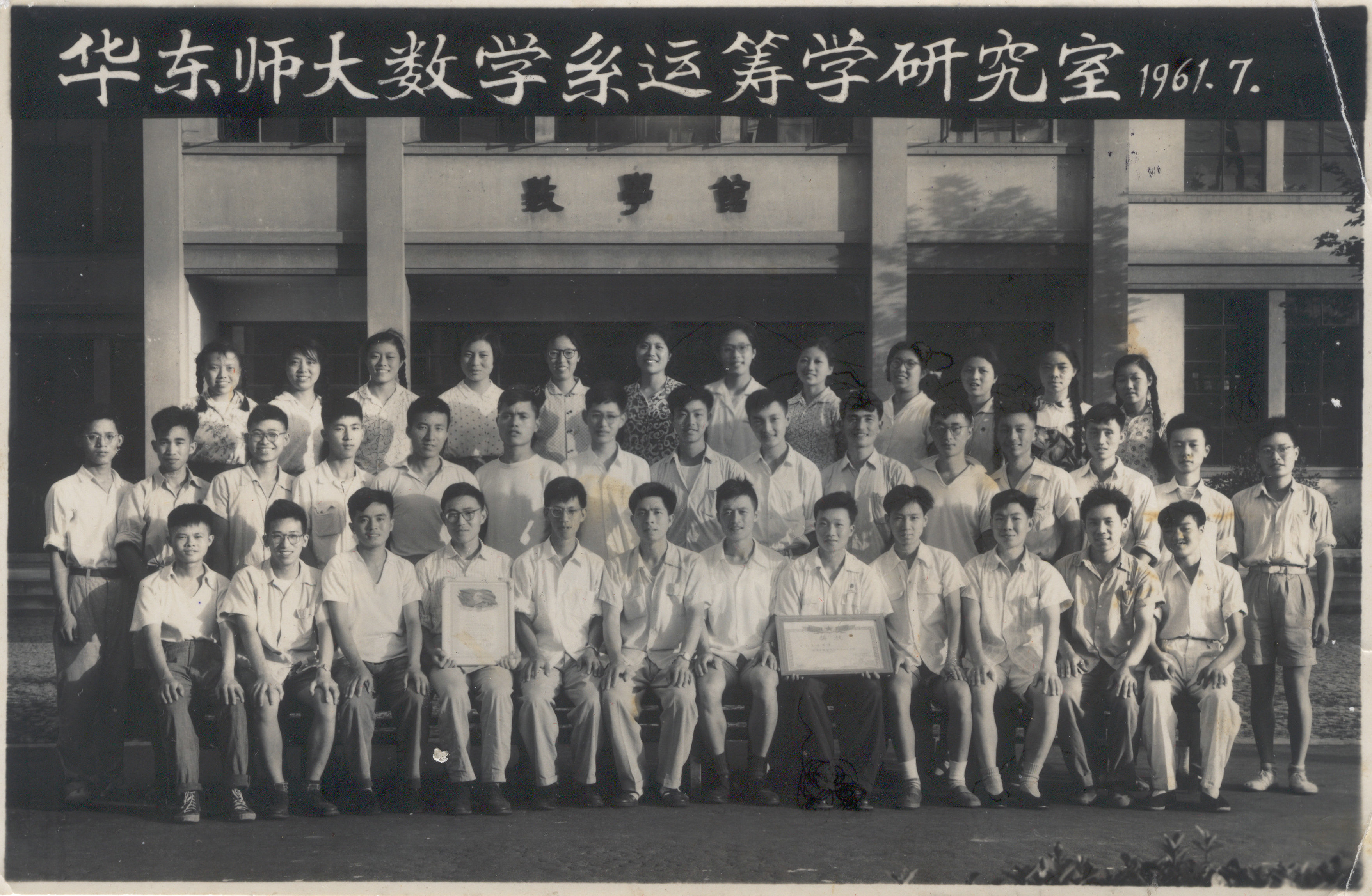 到1960年底,国家的政策有了新的调整。1961年初,运筹学研究室随之解体。教师也回到原来的教研室。学生回到各自的年级,恢复正常教学秩序。57级的学生,这时候已经是四年级了, 他们有好些课程需要补上。下面这张照片是拍摄于1961年7月,61届的学生即将毕业。照片中还有两张奖状,不知道是什么内容的奖状(照片由冯准提供,点击照片可显示更清晰大图)。