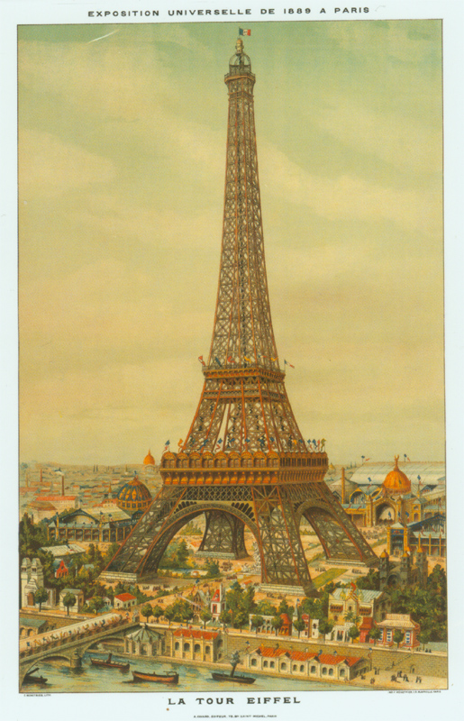 本文将主要介绍1889年举办的第三届巴黎世博会。因为1889年恰是法国大革命100周年,所以法国政府决定隆重庆祝,在巴黎举办一次规模空前的世界博览会, 以展示工业技术和文化方面的成就,并建造一座象征法国荣誉的纪念碑。为此向社会发出征求设计方案,结果在应征的700多份方案里, 选中建筑工程师居斯塔·埃菲尔(Alexandre-Gustave Eiffel,1832-1923,图3)设计的一座象征机器文明、在巴黎任何角落都能望见的巨塔。 这座巨塔将耸立在巴黎市区赛纳河畔的战神广场上,占地一公顷。它除了四个脚是用钢筋水泥之外,全身都用钢铁构成,铁塔的金属制件有1.8万多个, 使用铆钉250万个,总重达7000吨。塔分三层,从塔座到塔顶共有1711级阶梯。建成后的埃菲尔铁塔高300米,直到1930年它始终是全世界最高的建筑(图4---法国明信片)。 在铁塔的每一层都设有酒吧和饭馆,形成三个不同视野的了望台。一个世纪以来,每年大约有300万人登临塔顶,俯瞰巴黎市容,特别是在晴天, 这里可以看到远达70公里以内的所有景色。