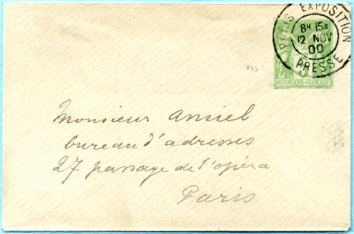 图1:盖有1900年巴黎世界博览会闭幕日(1900/11/12)邮戳的信封(法国邮资封,1900)