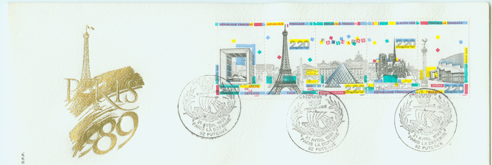 图23:在1989年埃菲尔铁塔建成100周年的时候,法国邮政当局发行一套“巴黎古迹”连张邮票, 它们依次是:拉德芳斯新凯旋门、埃菲尔铁塔、卢浮宫前的金字塔、巴黎圣母院和巴士底歌剧院。