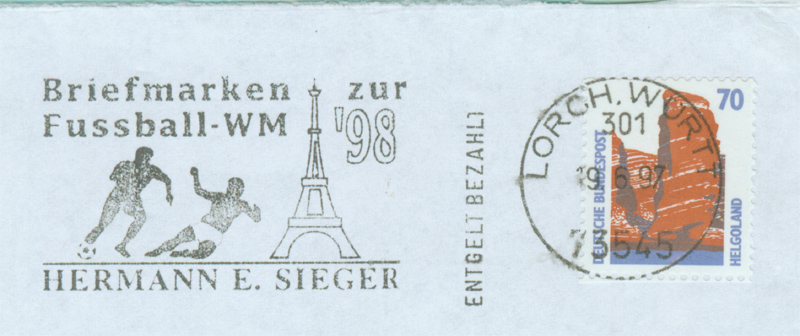 图26(左):1998年第16届在法国举办的足球世界杯(德国纪念邮戳,1997)    图27(右):法国冶金工会成立100周年纪念(法国邮票,2000)