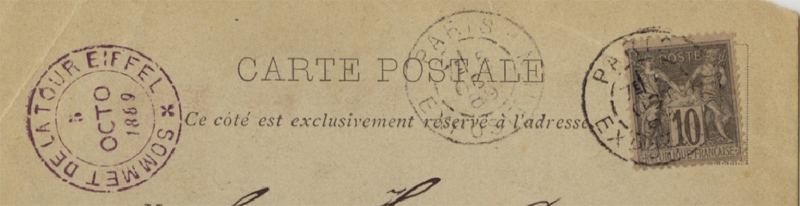 图9:巴黎世博会期间实寄明信片 右日戳“巴黎世博会”,左日戳“埃菲尔铁塔”(法国1889年10月5日实寄明信片上半部)
