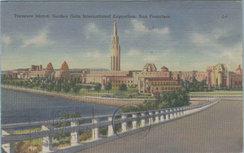 为庆祝旧金山金门大桥(图31)建成,与纽约世博会同时举办“旧金山金门世界博览会”。园区设在旧金山的金银岛上,这个小岛是建造金门大桥时挖出来的泥土构筑而成。 图32是盖有当年世博会纪念邮戳的园区概貌明信片和印有世博会标志性建筑“太阳塔”的纪念邮票。